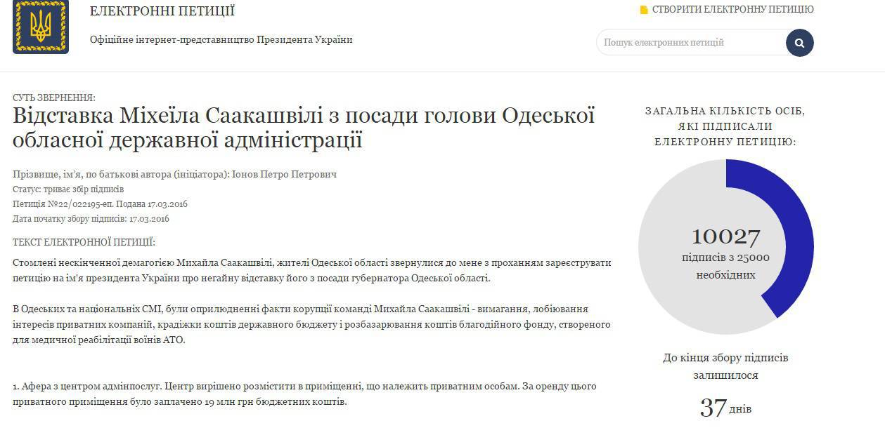 Петиция с требованием отставки с поста председателя Одесской областной администрации Михеила Саакашвили, которую подал депутат Одесского городского совета, Петр Ионов собрала более 10 тысяч подписей.