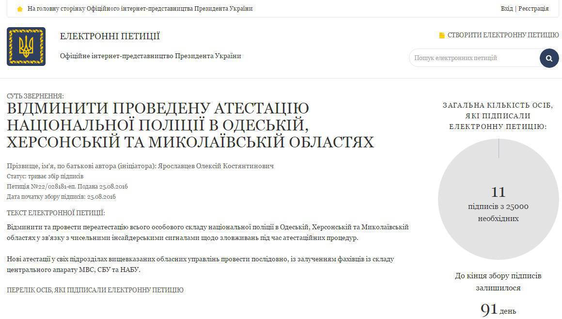 Электронная петиция с требованием отменить результаты аттестации сотрудников Национальной полиции Украины в Одесской области была зарегистрирована на сайте Администрации президента Украины 25 августа.