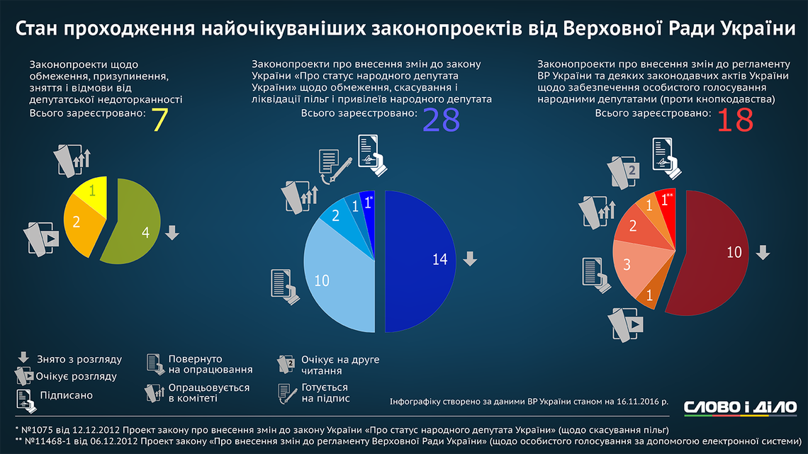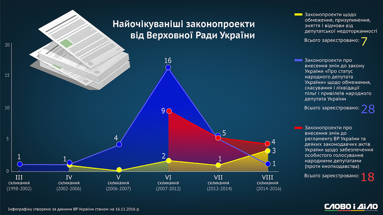 На протяжении всей истории работы Верховной Рады Украины было зарегистрировано 7 законопроектов об ограничении, приостановке, снятии или отказе от депутатской неприкосновенности