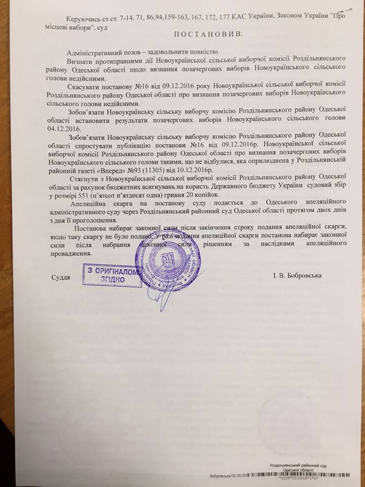 Раздельнянский районный суд Одесской области признал противоправным решение Новоукраинской избирательной комиссии о признании внеочередных выборов председателя сельсовета недействительными.