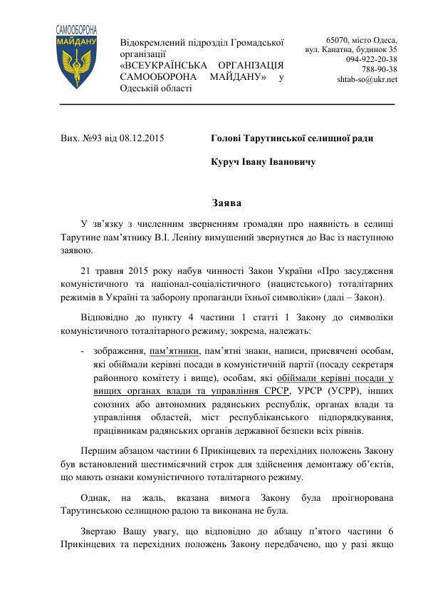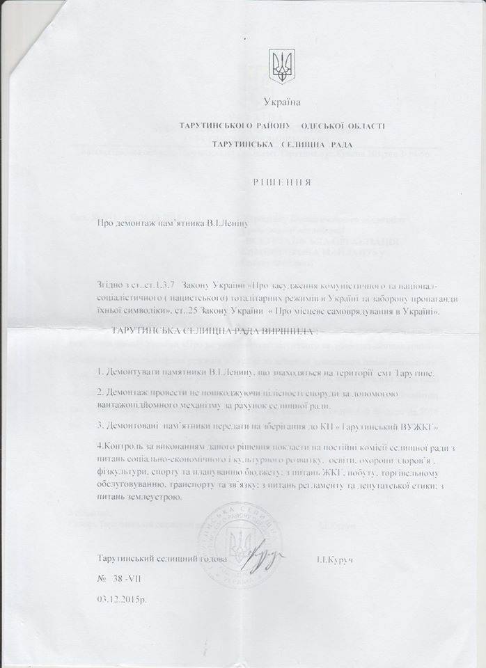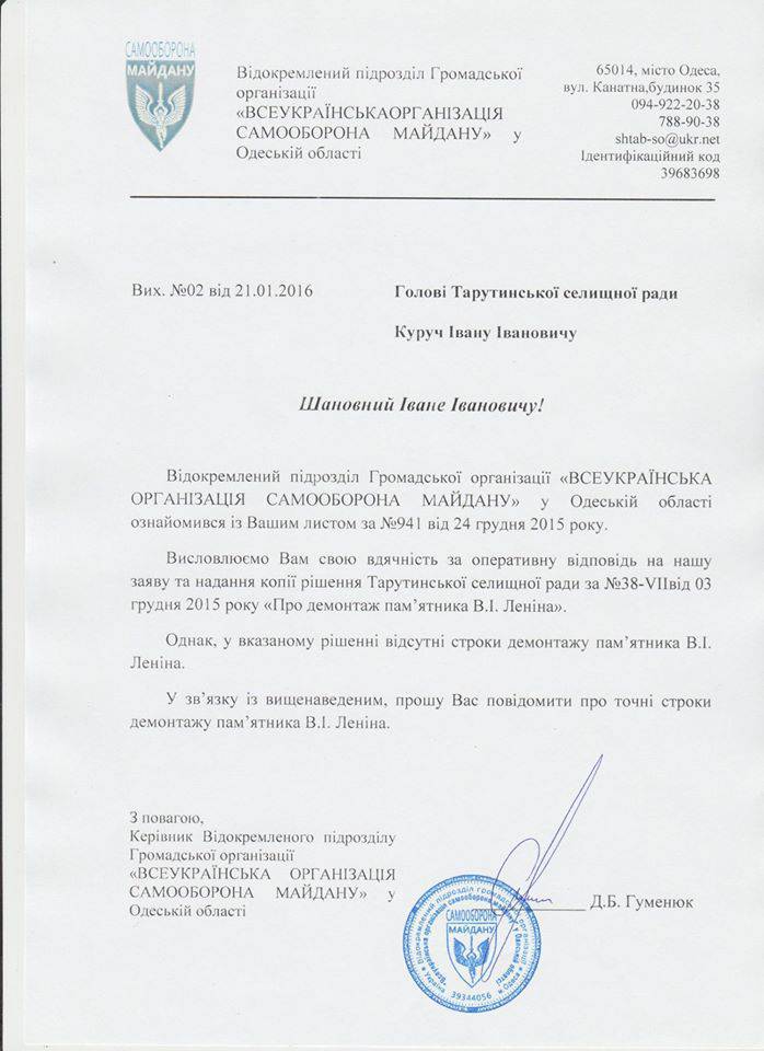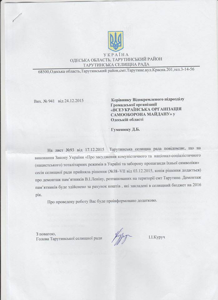 «Получив от жителей Тарутино информацию о невыполнении местными властями действий по демонтажу памятника, руководство Самообороны обратилось к председателю поселкового совета Ивану Куручу с просьбой посодействовать решению данного вопроса. Недавно в адрес организации пришел ответ, в котором господин председатель сообщает, что Тарутинский поселковый совет принял решение удовлетворить просьбу активистов и демонтировать памятник за счет средств поселкового бюджета», - сообщили в организации.