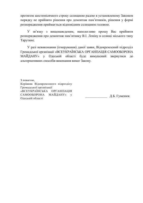 «Получив от жителей Тарутино информацию о невыполнении местными властями действий по демонтажу памятника, руководство Самообороны обратилось к председателю поселкового совета Ивану Куручу с просьбой посодействовать решению данного вопроса. Недавно в адрес организации пришел ответ, в котором господин председатель сообщает, что Тарутинский поселковый совет принял решение удовлетворить просьбу активистов и демонтировать памятник за счет средств поселкового бюджета», - сообщили в организации.