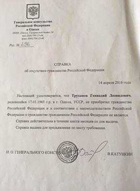 Мэр Одессы Геннадий Труханов обнародовал справку, подписанную исполняющим обязанности Генерального консула Российской Федерации в Одессе Валерием Катункиным, чтобы доказать отсутствие у него гражданства РФ