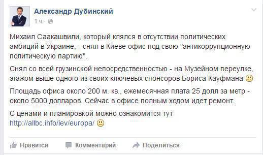 «Михеил Саакашвили, который клялся в отсутствии политических амбиций в Украине, - снял в Киеве офис под свою «антикоррупционную политическую партию». Снял со всей грузинской непосредственностью - на Музейном переулке, этажом выше одного из своих ключевых спонсоров Бориса Кауфмана. Площадь офиса около 200 кв. м, ежемесячная плата 25 долл. за метр - около 5000 долл. Сейчас в офисе полным ходом идет ремонт», - написал Александр Дубинский.