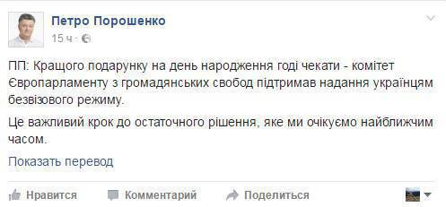 Президент Украины Петр Порошенко, которому 26 сентября исполнился 51 год, прокомментировал в Facebook итоги голосования в комитете Европарламента: