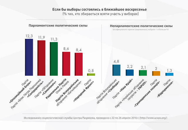Суммарный рейтинг политических сил, представленных в Верховной Раде Украины, составляет 53,3%. Таким образом, непарламентские партии имеют шанс получить до 50% голосов избирателей. Согласно полученным данным, «Оппозиционный блок» может набрать 12,3%, «БПП «Солидарность» - 11,9%, «Самопомич» - 11,3%, Радикальная Партия Ляшко - 8,6%, «Батькивщина» - 8,4% и «Народный фронт» - 0,8%.