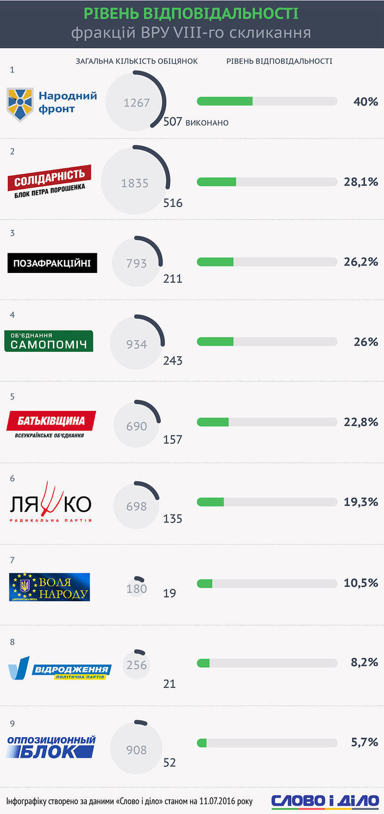 В результате исследований журналисты пришли к выводу, что самой ответственной фракцией в парламенте можно назвать фракцию «Народного фронта», которая, раздав 1 тысячу 267 обещаний, 507 из них выполнила. По состоянию на 11 июля уровень ее ответственности составляет 40%. Абсолютным рекордсменом по количеству розданных обещаний является фракция «Блока Петра Порошенко» - 1 тысяча 835 обязательств. «БПП» занимает второе место в рейтинге ответственности - 28,1% выполненных, а именно - 517.