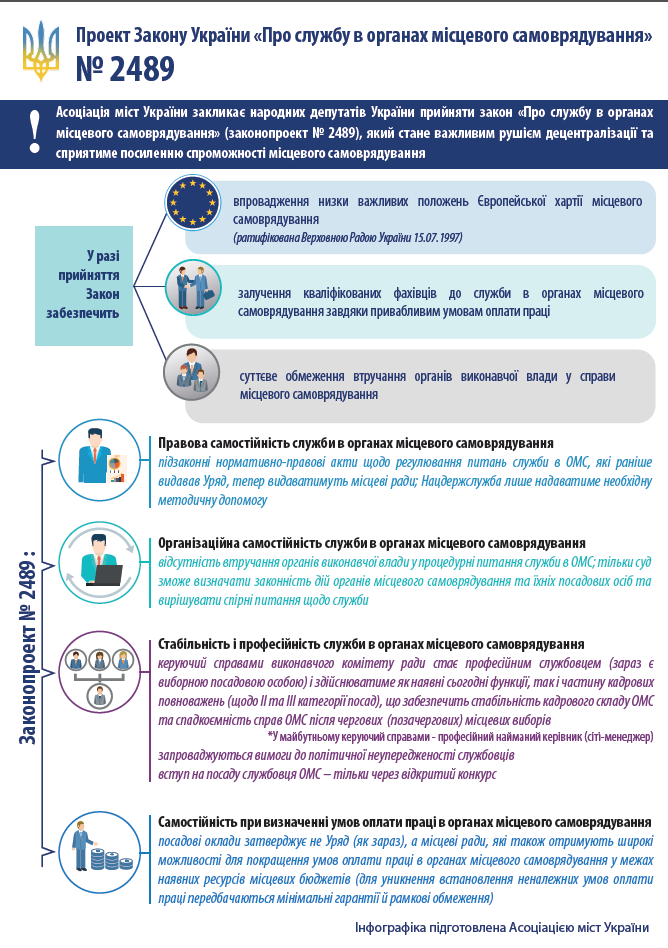 Ассоциация городов Украины убеждена, что принятие законопроекта будет важным шагом на пути поддержки и ускорения децентрализации и реформы местного самоуправления в Украине, будет способствовать усилению привлекательности службы в органах местного самоуправления и повышению профессионализма сотрудников.