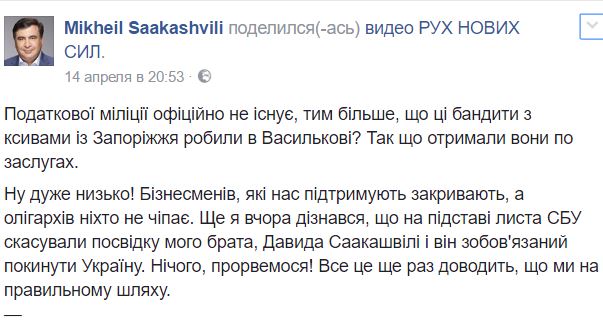 Об этом сам политик написал на своей странице в facebook: "На основании письма СБУ отменили вид на жительство моего брата, Давида Саакашвили и он обязан покинуть Украину".