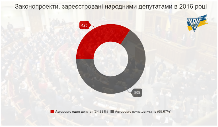 В свою очередь, исследование КИУ «Верховная Рада: итоги года» показало, что ряд народных депутатов регистрирует десятки законопроектов самостоятельно. Так, в 2016 году народный депутат Евгений Мураев самостоятельно зарегистрировал 59 законопроектов. Среди лидеров также депутаты Юрий Бублик - 21 законопроект, Сергей Мищенко - 18, Антон Яценко - 13. А народный депутат Вадим Рабинович в течение года зарегистрировал по законопроекту на каждую резонансную тему, которая была интересна для СМИ. Среди них и борьба с оффшорами, терроризмом, переименование географических объектов, льготное обеспечение граждан лекарствами и даже роль Украины в вопросе распределения мигрантов.