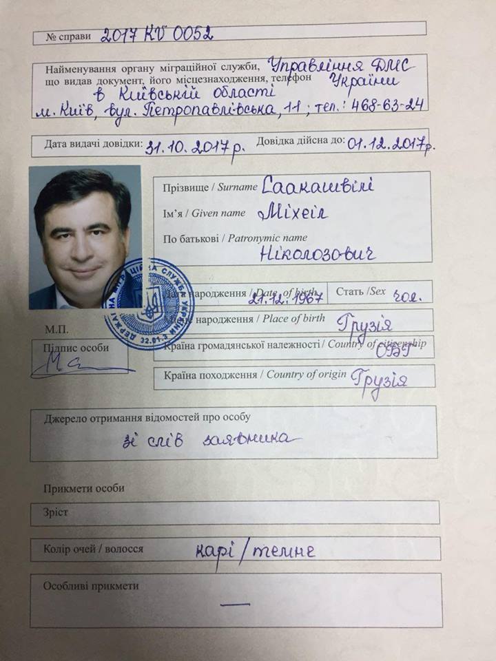 Бывший глава Одесской областной государственной администрации Михеил Саакашвили получил справку, удостоверяющую законность его пребывания на территории Украины.