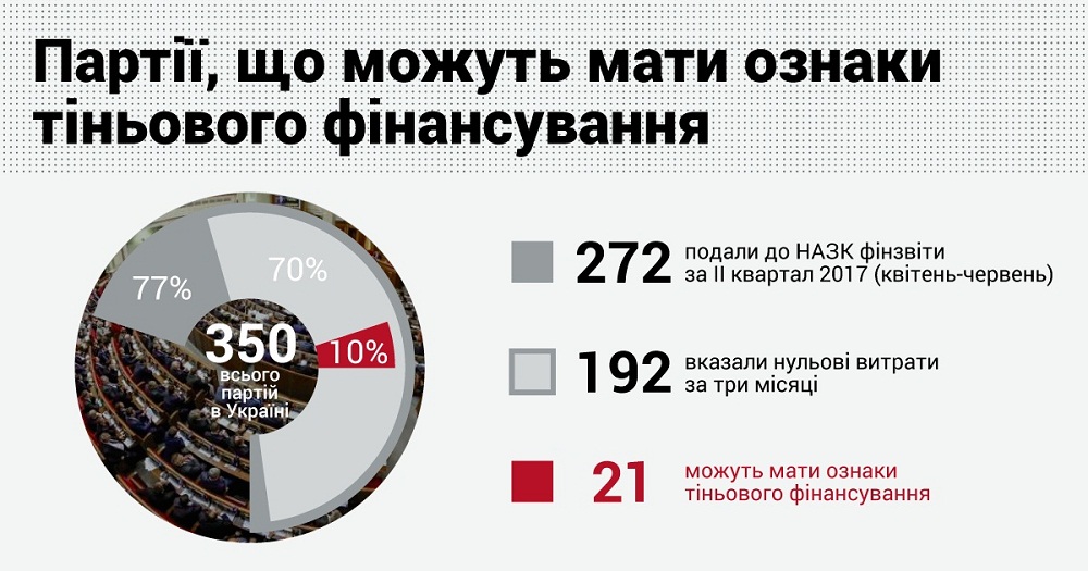 КИУ проанализировал отчеты политических партий за второй квартал 2017 года и обнаружил, что 70% партий не отметили никаких расходов за апрель-июнь. Так, «нулевые отчеты» подали 192 партии из всего 272, чьи отчеты доступны на сайте НАПК. Несмотря на формально нулевые расходы, 19 политических партий ведут активную деятельность. В частности, регулярно наполняют и поддерживают деятельность своих сайтов, организуют встречи с гражданами, проводят круглые столы, конференции и ведут другую деятельность, которая требует существенных денежных затрат.