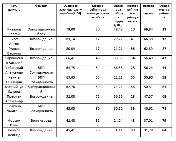А лучший результат среди одесских мажоритарщиков - 13-е место в рейтинге - занял Сергей Кивалов. Такой результат обусловлен посещением 83% пленарных заседаний Рады, двумя зарегистрированными законопроектами, тремя запросами, два из которых относительно проблем округа, одним выступлением по сути в парламенте, проведением личного приема избирателей, десятью встречами с избирателями, участием в телеэфире, на котором частично отчитался о своей деятельности.