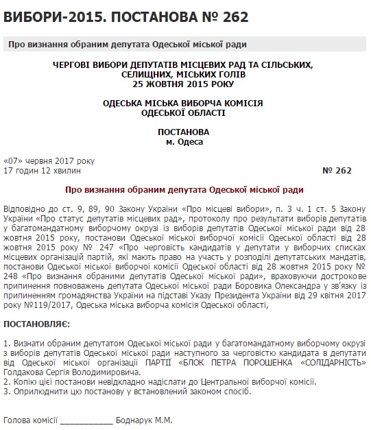 «В соответствии со ст. 9, 89, 90 Закона Украины «О местных выборах», п. 3 ч. 1 ст. 5 Закона Украины «О статусе депутатов местных советов», протокола о результатах выборов депутатов в многомандатном избирательном округе по выборам депутатов Одесского городского совета от 28 октября 2015 года, постановления Одесской городской избирательной комиссии Одесской области от 28 октября 2015 года № 247 «Об очередности кандидатов в депутаты в избирательных списках местных организаций партий, имеющих право на участие в распределении депутатских мандатов, постановления Одесской городской избирательной комиссии Одесской области от 28 октября 2015 № 248 «О признании избранными депутатов Одесского городского совета», учитывая досрочное прекращение полномочий депутата Одесского городского совета Александра Боровика в связи с прекращением гражданства Украины на основании Указа Президента Украины от 29 апреля 2017 №119 / 2017, Одесская городская избирательная комиссия Одесской области, комиссия постанавливает признать избранным депутатом Одесского городского совета в многомандатном избирательном округе по выборам депутатов Одесского городского совета следующего по очередности кандидата в депутаты от Одесской городской организации партии «Блок Петра Порошенко «Солидарность» Сергея Голдакова», - говорится в документе.