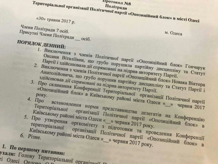 Издание Думская опубликовало документ, озаглавленный как «Протокол №8 политсовета Территориальной организации политической партии «Оппозиционный блок» в городе Одессе».
