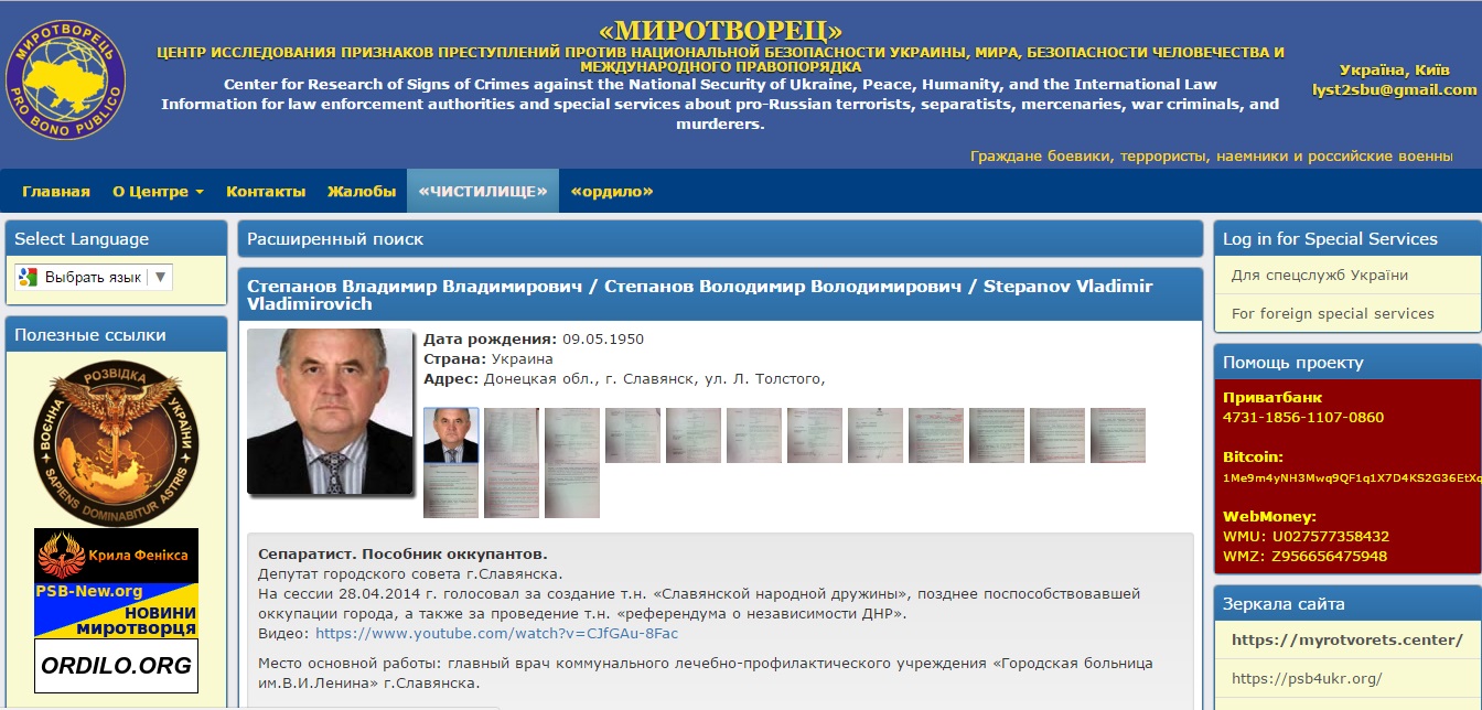 Отец нового председателя Одесской областной государственной администрации Максима Степанова – Владимир Степанов, работающий главврачом городской клинической больницы Славянска, оказался в «чистилище» сайта «Миротворец».