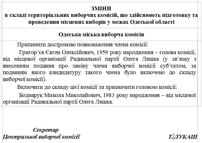 Партия Ляшко сменила главу Одесской городской избирательной комиссии