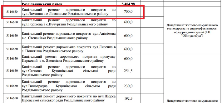 Впрочем, как удалось выяснить, изучив принятый на сессии Одесского облсовета 21 марта областной бюджет, средства на капремонт этой улицы в размере 700 тыс. грн были выделены из областной казны. При этом ничего не известно о том, выделялись ли средства лично народным депутатом или депутатом областного совета.