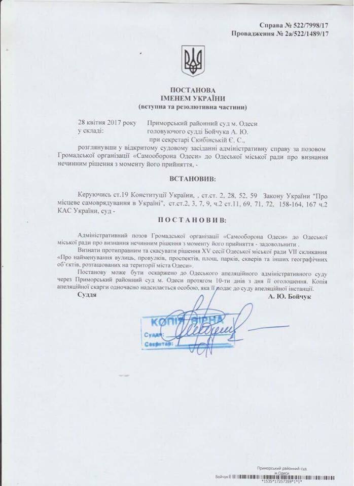 Сегодня, 28 апреля, организации «Свободные Люди. Одесса» и «Самооборона Майдана Одессы» подали исковое заявление, требуя от Одесского городского совета отмене решения, ссылаясь на несоответствие требованиям декомунизацийних законов и нарушение регламента во время представления и голосования.