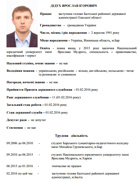 По результатам внеплановой проверки была составлена справка по вопросам соблюдения требований Закона Украины «О государственной службе» и нормативно - правовых актов Украины по вопросам государственной службы в Балтский РГА Одесской области, которая указывает, что правовые основания для назначения путем перевода Ярослава Дидуха на должность первого заместителя председателя Балтского районной государственной администрации отсутствуют.