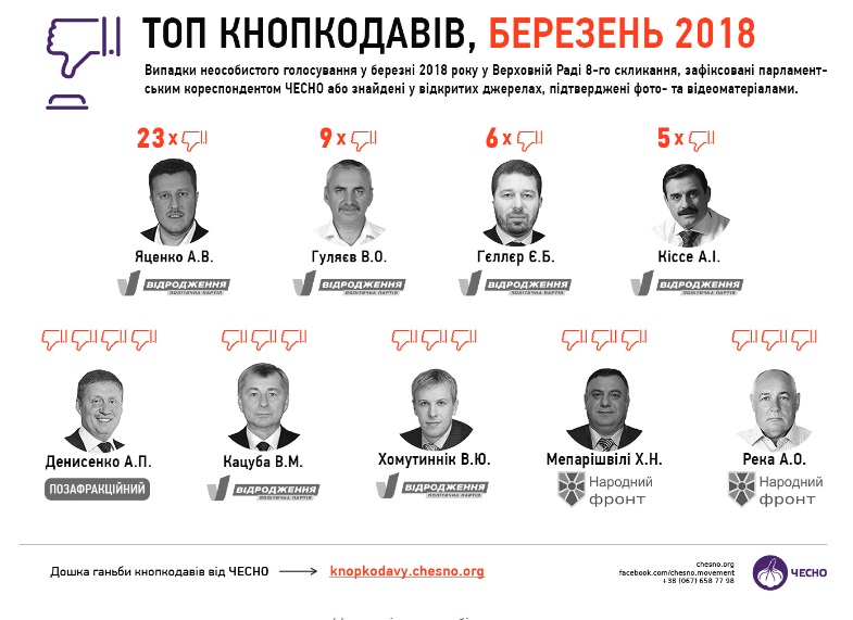 Как отмечает Общественное движение ЧЕСНО, по меньшей мере 18 нардепов кнопкодавили 72 раза во время голосований Верховной Рады Украины в марте 2018 года.