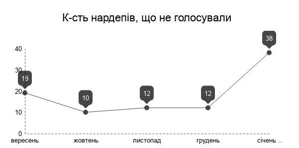 «В январе часть народных депутатов традиционно продолжали находиться в так называемых неформальных отпусках, а потому не принимали участия в работе парламента. Так, из 38 депутатов, которые не голосовали, 60% находились на момент голосований за Верховной Радой. Показатели участия нардепов в голосованиях за январь значительно ниже, чем в предыдущие месяцы. Для сравнения: в декабре пропустили все голосования ВР 12 депутатов, ноябре - также 12 октябре - 10, сентябре - 19», - отметил председатель КИУ Алексей Кошель.