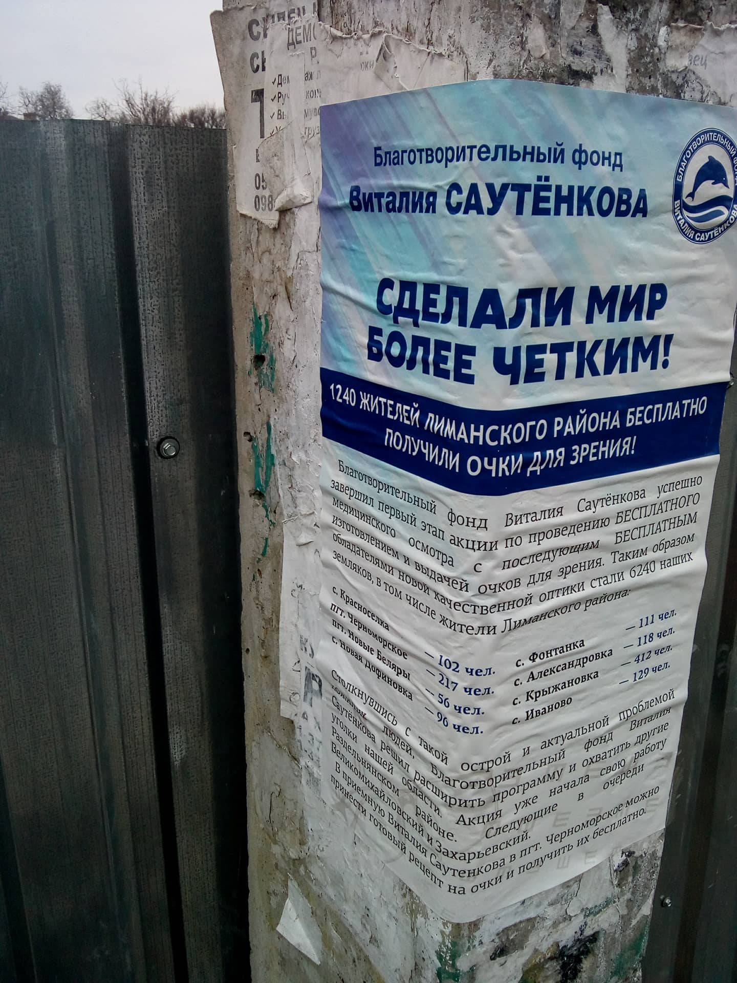 Депутат Одесского областного совета не только отчитался о своей работе через СМИ и социальные сети, но и провел определенную работу с помощью печатной продукции. Как сообщают жители Суворовского района Одессы, в районе спуска к морю возле села Крыжановка Лиманского района на столбах расклеены плакаты от имени Виталия Саутенкова. "Сделали мир более четким", - хвастается народный избранник, имея в виду, что за счет его благотворительного фонда жителям пригородных сел Александровка, Фонтанка, Крыжановка, Новые Беляры, Красноселка, Иваново, Черноморское и Новая Дофиновка купили очки.