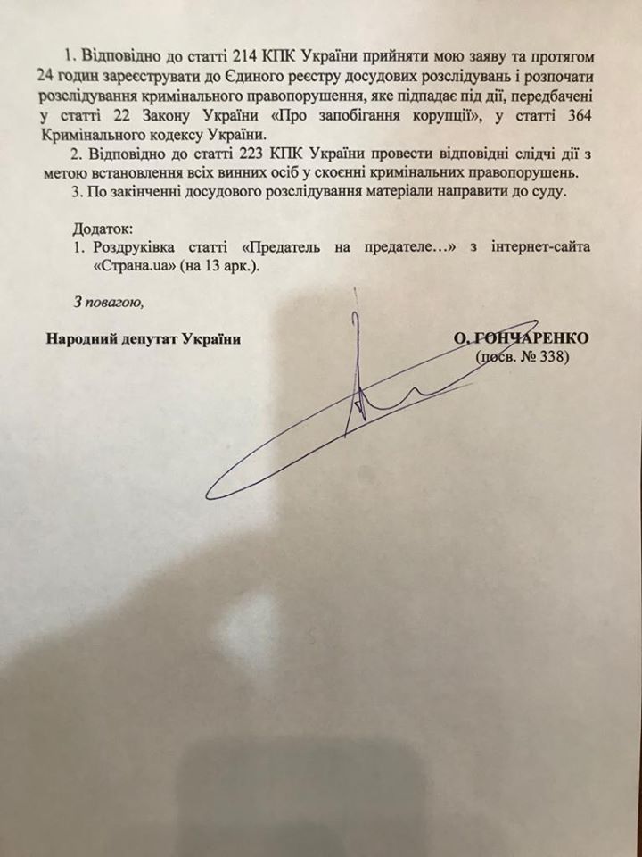 Об этом на своей странице в Facebook сообщил народный депутат Украины Алексей Гончаренко.