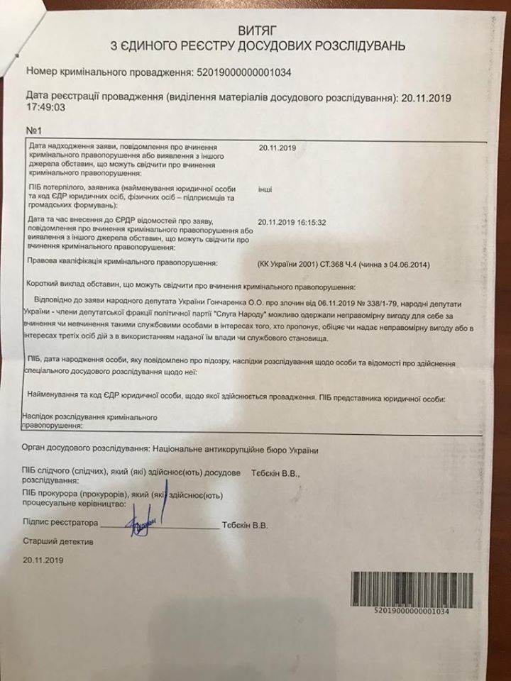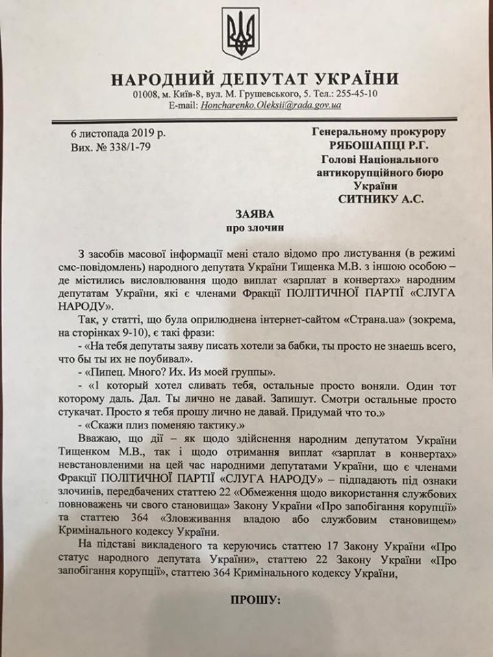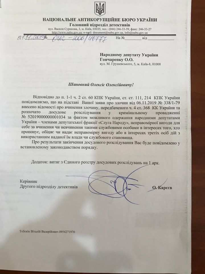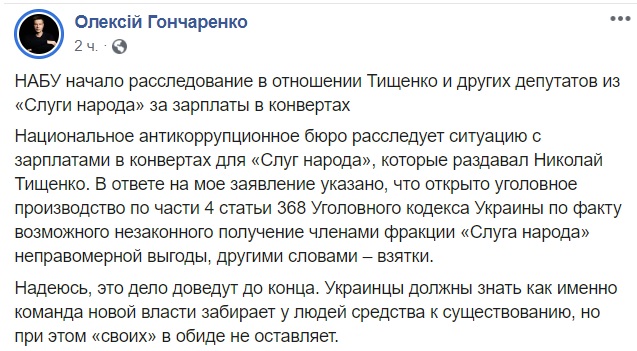 «Национальное антикоррупционное бюро расследует ситуацию с зарплатами в конвертах для «Слуг народа», которые раздавал Николай Тищенко. В ответе на мое заявление указано, что открыто уголовное производство по части 4 статьи 368 Уголовного кодекса Украины по факту возможного незаконного получение членами фракции «Слуга народа» неправомерной выгоды, другими словами – взятки», - написал депутат.