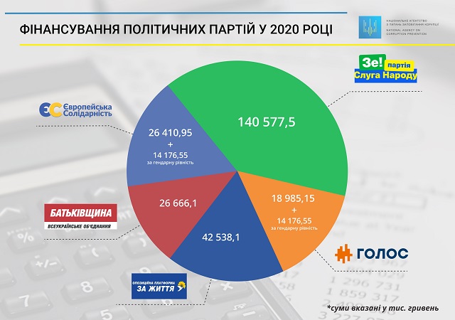 По бюджетной программе «Финансирование уставной деятельности политических партий» Национальному агентству в 2020 году утверждены расходы в объеме 283 млн 530,9 тыс. грн. Из этих средств пропорционально количеству полученных голосов избирателей политические партии получают: «Слуга народа» - 140 млн 577,5 тыс. грн; «Оппозиционная платформа - За жизнь» - 42 млн 538,1 тыс. грн; «Всеукраинское объединение «Батькивщина» - 26 млн 666,1 тыс. грн; «Европейская Солидарность» - 26 млн 410,95, тыс. грн; «ГОЛОС» - 18 млн 985,15 тыс. грн.