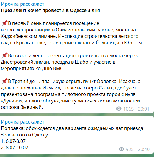 По ее словам, в Офисе президента обсуждают две даты визита: либо с 6 по 8 июля, либо с 8 по 10 июля. В тоже время, в Одесской областной государственной администрации ИзбирКому сообщили, что точно о визите неизвестно, так как пока его не подтвердили в ОП.