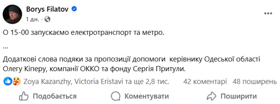 Ранее Борис Филатов действительно написал, что Олег Кипер предложил помощь. В 15:00 запускаем электротранспорт и метро. Дополнительные слова благодарности за предложения Олегу Киперу и фонду Сергея Притулы.