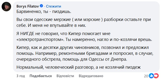 "Барвиненко, ты - пи.дыш. Вы свои мэрские разборки оставьте себе и меня не впутывайте. Я нигде не говорил, что Кипер помогает мне электротранспортом. Ты сознательно, нагло врешь. Кипер, как и десятки других чиновников, позвонил и предложил помощь. Например ремонтными бригадами и попросил в случае следующего обстрела, помочь Одессе от Днепра. Нормальный человеческий разговор", - написал мэр.