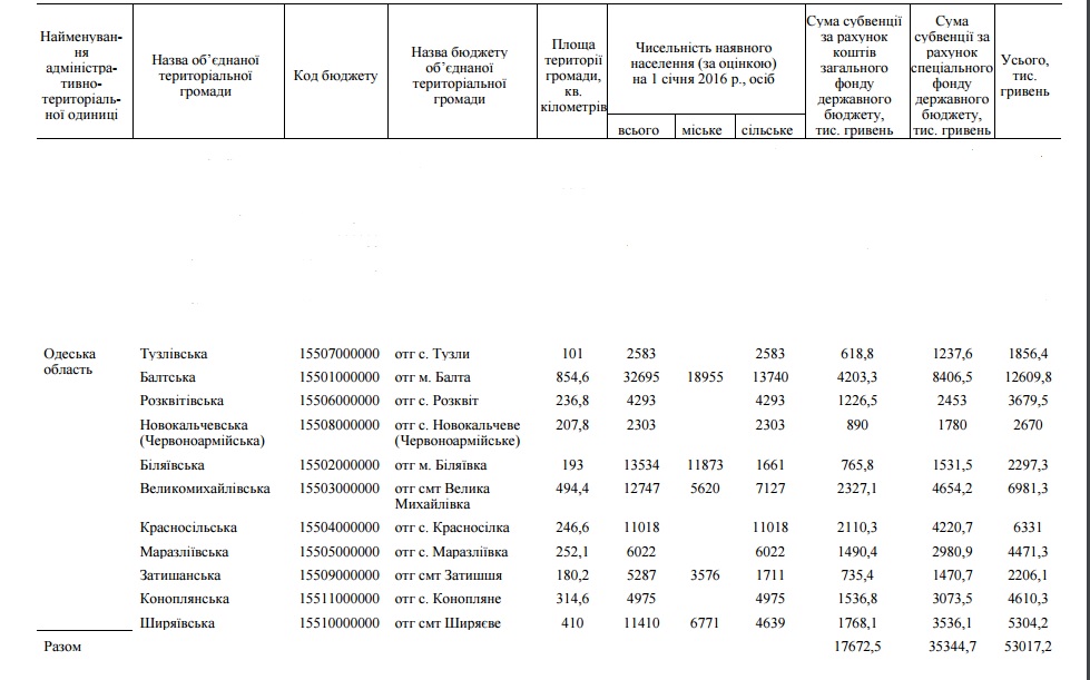 Субвенцию получат 11 ОТГ области, созданные в 2015 и 2016 годах. Так, для Балтской громады направят 12 млн 609,8 тыс. грн, Беляевской – 2 млн 297,3 тыс. грн, Великомихайловской – 6 млн 981,3 тыс. грн, Ширяевской – 5 млн 304,2 тыс. грн, Коноплянской, - 4 млн 610,3 тыс. грн, Маразлиевской – 4 млн 471,3 тыс. грн, Красносельской – 6 млн 331 тыс. грн, Розквитовской – 3 млн 679,5 тыс. грн, Новокальчевской – 2 млн 670 тыс. грн, Затишанской – 2 млн 206,1 тыс. грн, Тузловской – 1 млн 856,4 тыс. грн.
