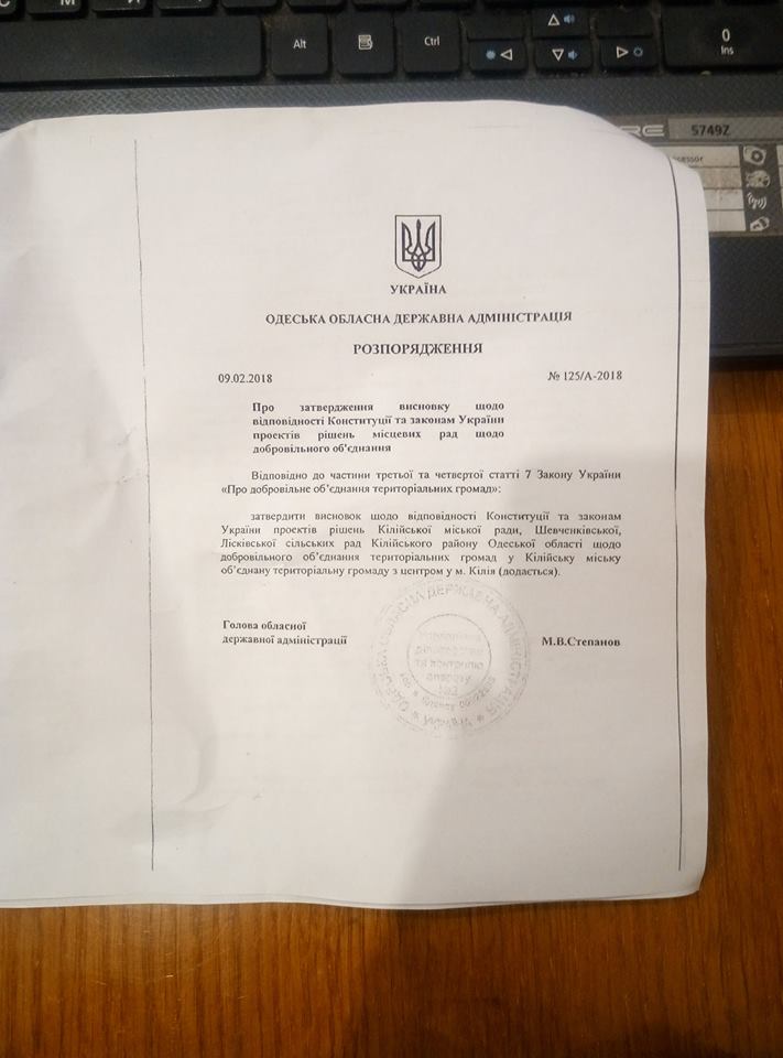 Председатель Одесской облгосадминистрации Максим Степанов подписал распоряжение об утверждении положительного заключения о соответствии Конституции и законодательству Украины проектов решений местных советов Килии, Шевченково и Лесков относительно добровольного объединения территориальных громад в Килийскую городскую ОТГ с центром в г. Килия