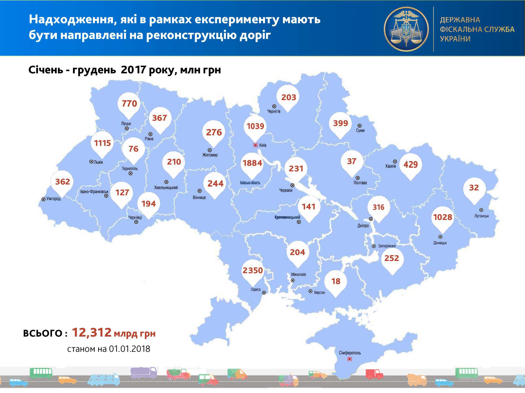 По информации ГФС, благодаря перевыполнению таможенных поступлений в бюджет за 2017 в рамках таможенного эксперимента на развитие дорожной инфраструктуры должно быть направлено 12 млрд. 312 млн. грн.