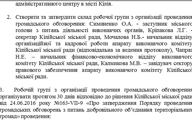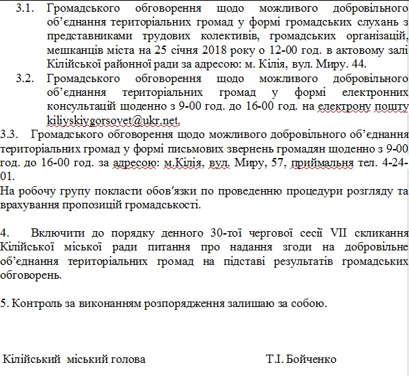 В городском совете создали рабочую группу, которая должна будет организовать общественные обсуждения в городе на 25 января. На основании результатов общественных обсуждений вопрос об объединении включат в повестку дня 30-й очередной сессии VII созыва Килийского городского совета.