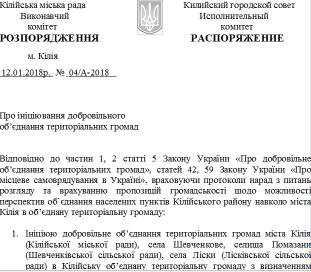 Согласно ее распоряжению, предлагается объединить город Килию с селами Шевченково и Лески, а также с поселком Помазаны.