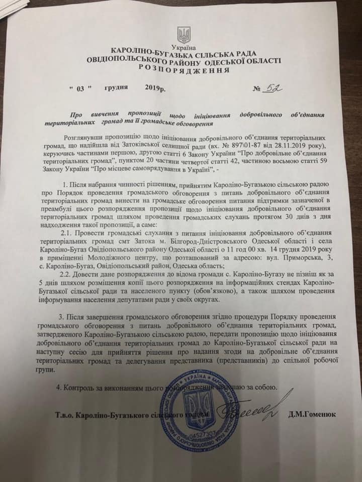 Исполняющая обязанности главы Каролино-Бугазского сельского совета Дина Гоменюк подписала распоряжение о созыве общественных слушаний для обсуждения предложения Затоки об объединении в одну громаду.