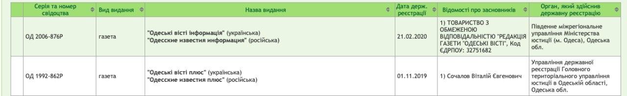 Однако, согласно данным госреестра, лицензию выдали не КП «Редакция газеты «Одесские известия», а Виталию Сочалову, который ранее работал заместителем главного редактора издания. При этом газета называется «Одесские известия плюс».