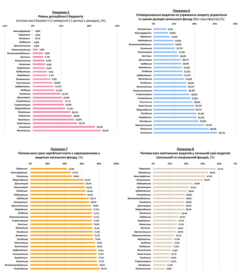 В частности, Куяльницкая ОТГ поднялась на 13-е место среди 95 крупных ОТГ Украины (ранее находилась на 27-м). Великомихайловская ОТГ с 50-й переместилась на 19-ю позицию, значительно превысив рейтинг Любашевской и Красносельской ОТГ, которые традиционно находились выше в своей группе.