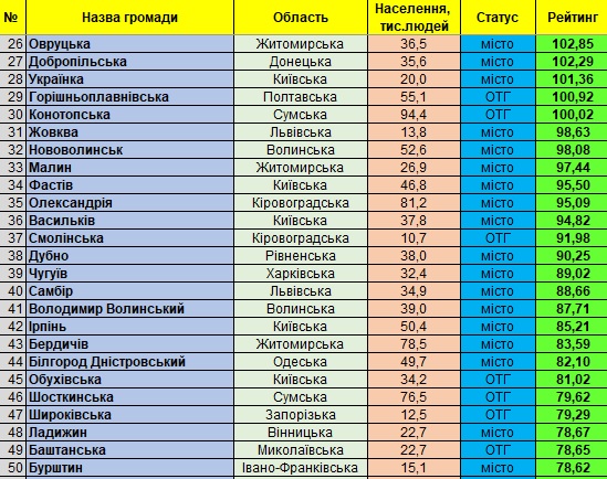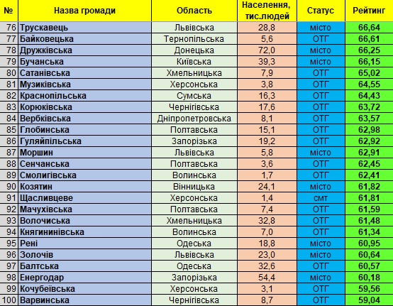 В ТОП-200 попали девять громад региона, однако лидирующих позиций они не заняли. Так, лучший из них - город Белгород-Днестровский, оказался на 44-й позиции. Беляевская ОТГ - н-а 75 месте. В сотню попала также громада Рени, занявшая 95 место.