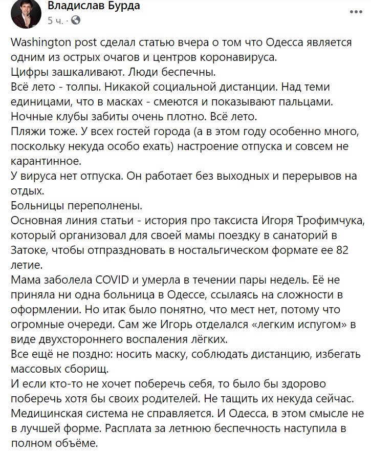 Известное американское издание The Washington Post опубликовало статью, в которой назвало Одессу одной из горячих точек начавшейся второй волны коронавируса в Европе.