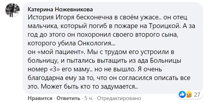 "История Игоря бесконечна в своем ужасе. Он отец мальчика, который погиб в пожаре на Троицкой. А за год до этого он похоронил своего второго сына, которого убила онкология... он "мой пациент". Мы с трудом его устроили в больницу, и пытались вытащить из ада больницы №3 его маму... но не вышло. Я очень благодарна ему за то, что он согласился описать все это. Может быть, кто-то задумается…", - написала волонтер.