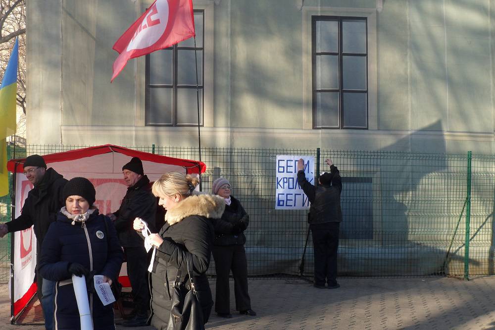 09:49 У здания мэрии - около 50 митингующих. Часть из них стоит под флагом партии "Сила людей". Остальные - сторонники Евромайдана, которые, по словам активиста Сергея Гуцалюка, пришли, чтобы проконтролировать, проголосует ли совет за признание Российской Федерации агрессором. Также здесь находится палатка партии "5.10" с лозунгом: "Беги, кролик, беги"