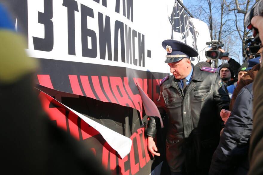 09:59 Сотрудники полиции вызвали взрывотехников, поскольку не знают, что внутри автомобиля. При этом водитель автомобиля - в бронежилете. Митингующие прокололи два колеса. Когда сорвали баннер против Саакашвили, под ним оказалась надпись за Дарта Вейдера
