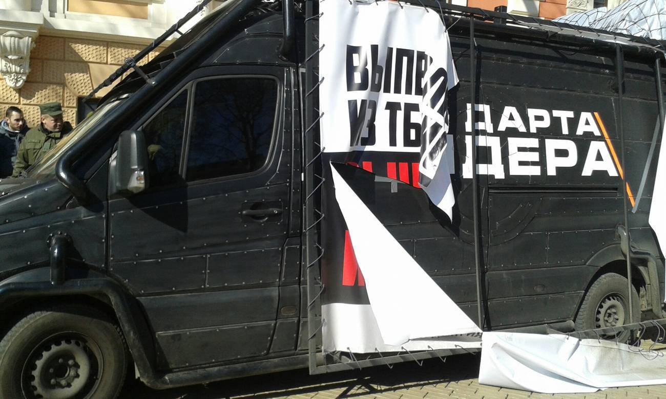 09:56 К зданию горсовета, несмотря на запрещающие знаки, подъехала машина, на которой размещены баннеры с призывами "выгнать" из Одессы Михеила Саакашвили. Митингующие срывают с нее баннеры и пытаются перевернуть машину. Внутри машины заперлись люди, они не открывают двери и включили громкоговорители, из динамиков доносятся призывы против губернатора. Полиция пытается решить проблему.