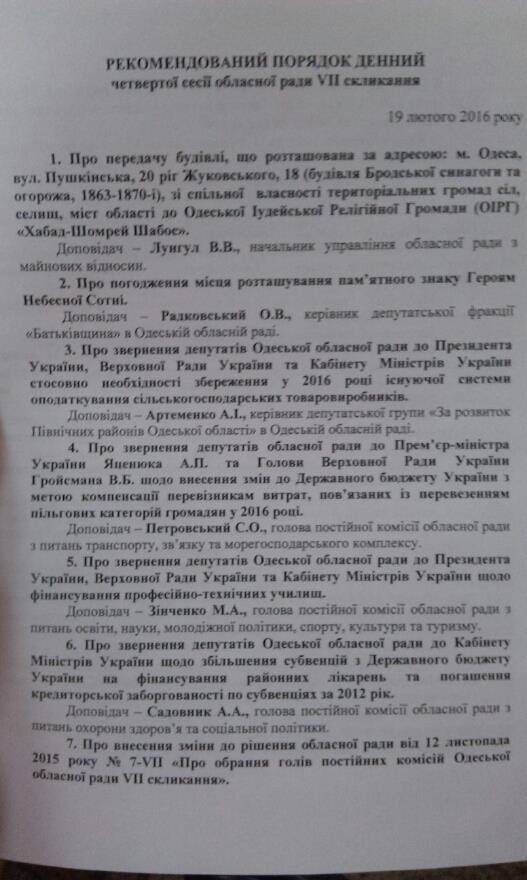12:26 Первый вопрос - о передаче здания облархива иудейской общине. Депутат Финик говорит, что главный вопрос - куда переедет областной архив. Предлагает дать возможность выступить руководителю облархива и услышать его позицию и выяснить, куда планируется перенести облархив. Руководитель управления имущественных отношений В. Лунгул говорит, что архив можно перенести в Александровку Коминтерновского района, возможностей у облсовета найти большое помещение для архива в Одессе, нет