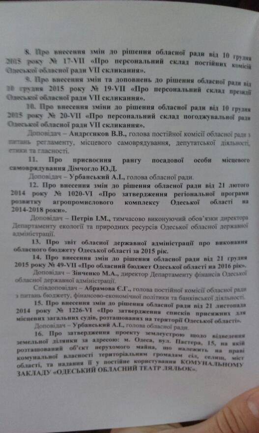16:40 Депутат Артеменко обращается к Саакашвили и Урбанскому с просьбой обратить внимание на проблему с аварийным состоянием моста через Будакский лиман. Депутат считает, что без решения этой проблемы развитие курортного поселка будет невозможно. Депутат посит, чтобы Саакашвили распорядился об экспертизе относительно состояния моста. Решение поддержано 45 голосами