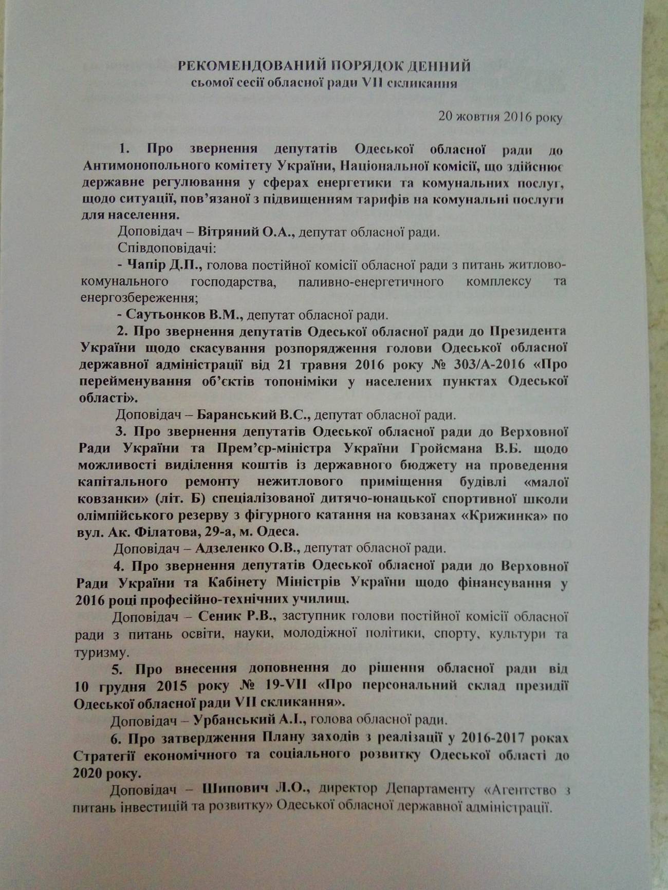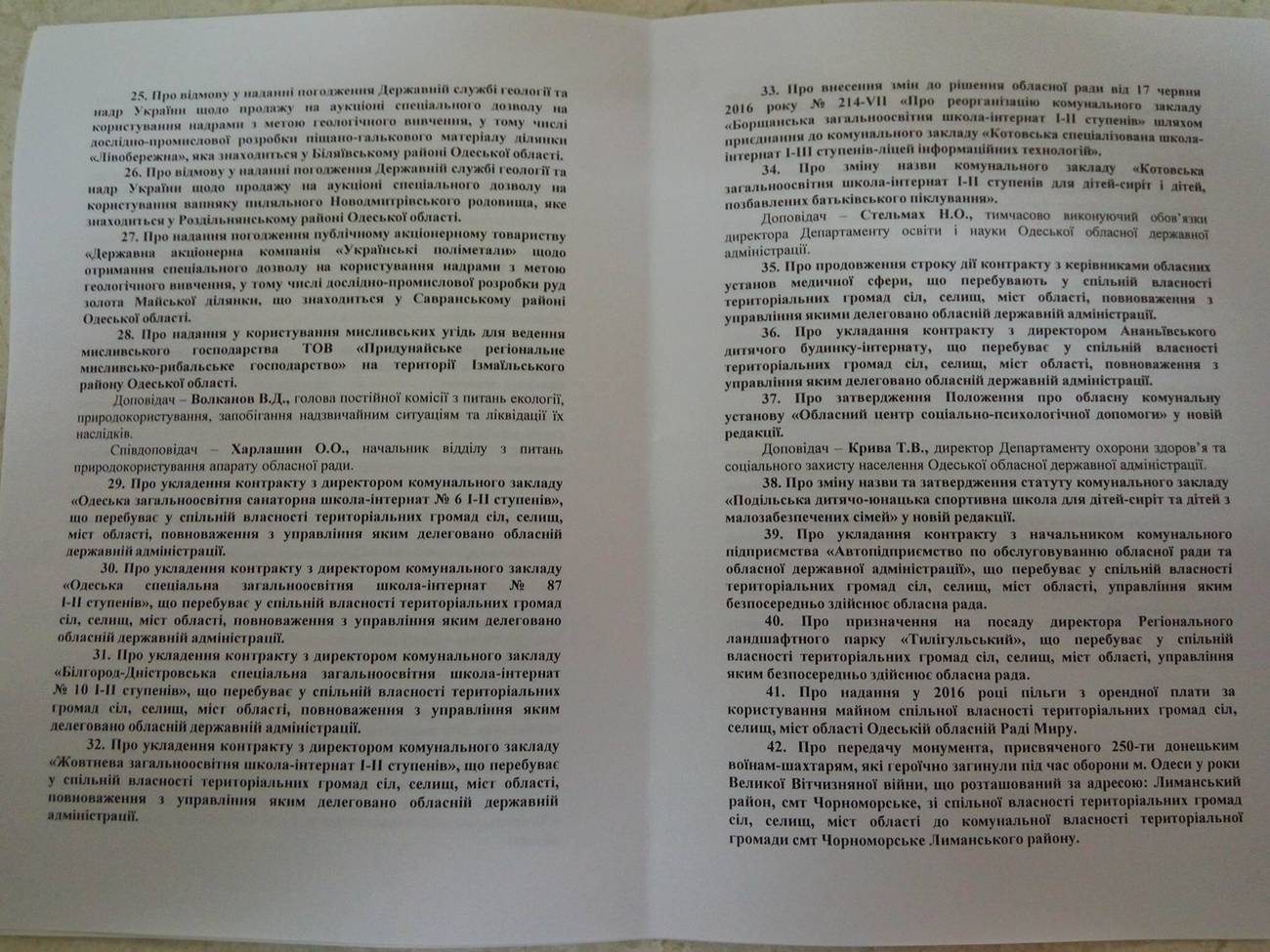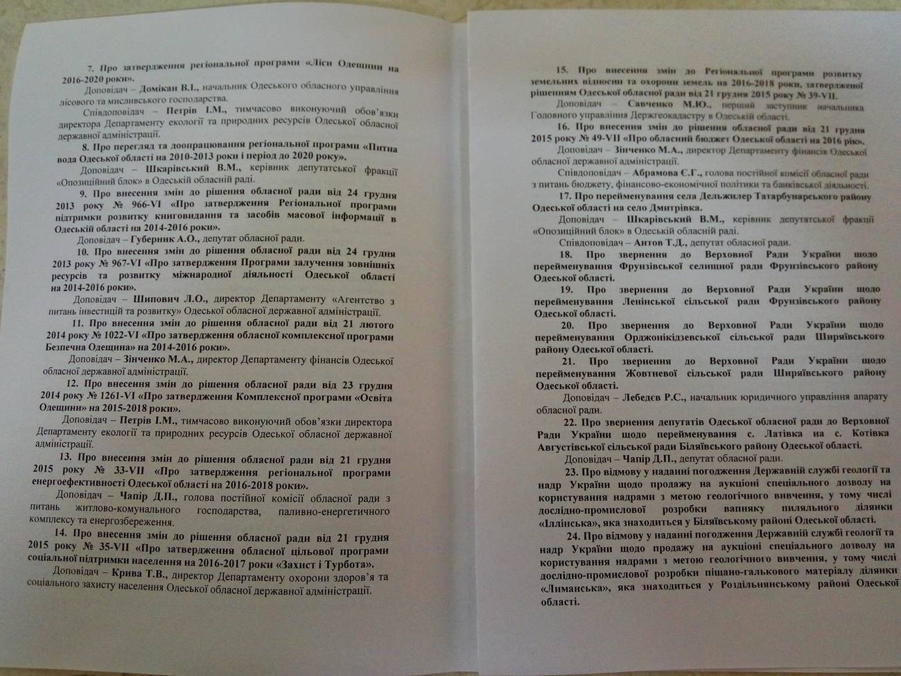 В предварительной повестке дня, опубликованной 9 сентября, значились только два проекта решения: «Об утверждении Плана мероприятий по реализации в 2016-2017 годах Стратегии экономического и социального развития Одесской области до 2020 года», и «О внесении изменений в решение областного совета от 24 июня 2015 года № 1392-VI «Об одобрении перспективного плана формирования территорий громад Одесской области».